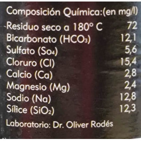 Es un agua de mineralización débil, con un residuo seco de 74 mg/l, lo que significa que tiene un bajo contenido de sales minerales y es adecuada para dietas pobres en sodio y para la preparación de alimentos infantiles .