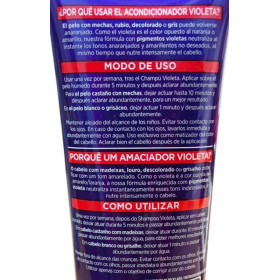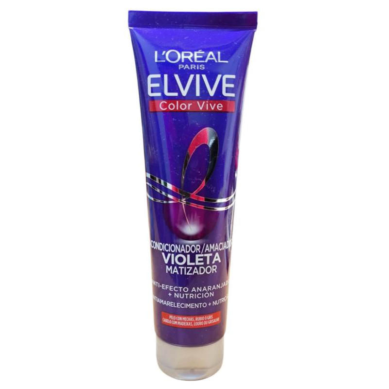 El L'Oreal Elvive Violet Conditioner 150 ml (y variantes similares) está formulado con pigmentos violetas que neutralizan los tonos amarillos y anaranjados que aparecen con mechas, rubio, decolorado o gris, dejando el color más brillante y fresco .