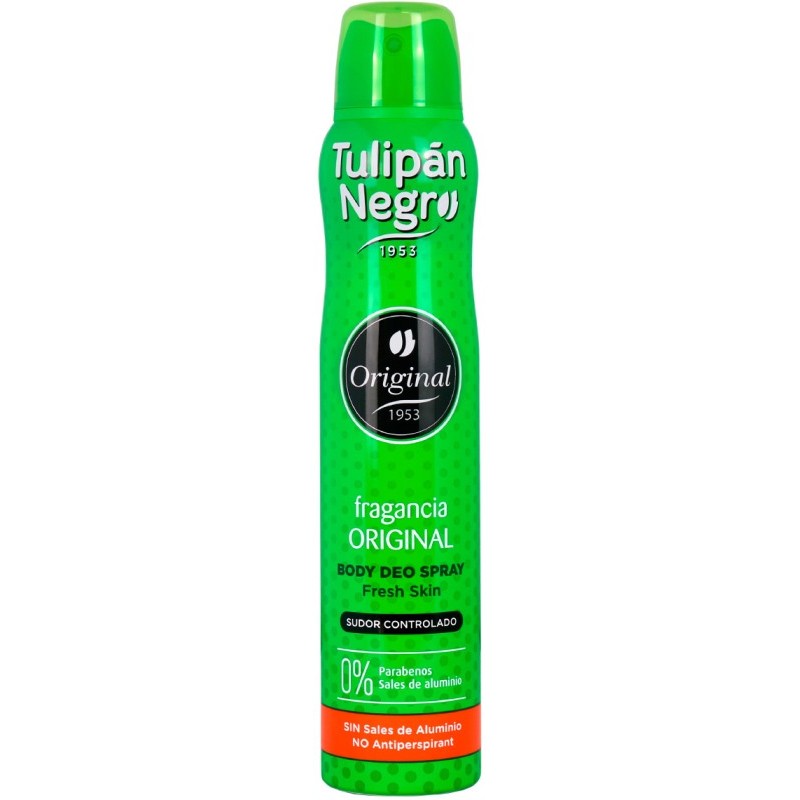 Desodorante Tulipán Negro Original en Spray, con una fórmula sin sales de aluminio ni parabenos, y una fragancia fresca y duradera .