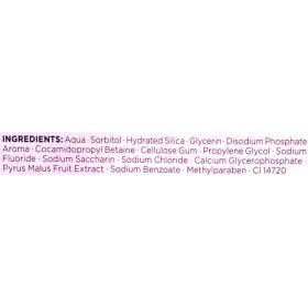 Entre sus ingredientes se encuentran: agua, sorbitol, sílice hidratada, glicerina, fosfato disódico, aroma, betaina de cocamidopropilo, goma de celulosa, propilenglicol, fluoruro de sodio, sacarina sódica, cloruro de sodio, glicerofosfato de calcio, extracto de manzana, benzoato de sodio, metilparabeno y CI 14720 .