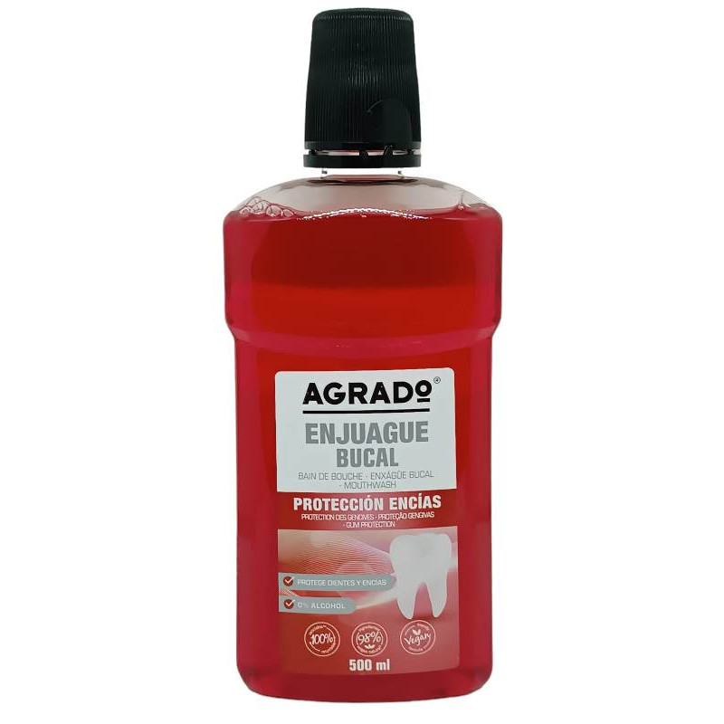El enjuague bucal Agrado es un producto de higiene oral que contribuye a obtener unos dientes más sanos y a prevenir el mal aliento .