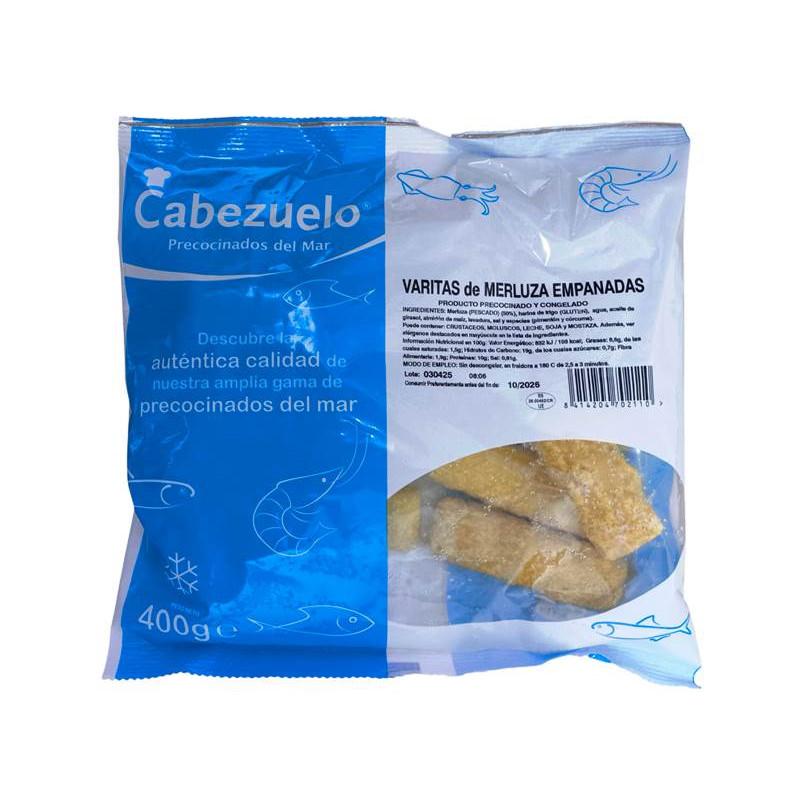 Las Varitas de Merluza Empanadas Cabezuelo, son un producto congelado de pescado blanco, recubierto con un empanado dorado y crujiente, ideal para preparar de forma rápida en freidora u horno .