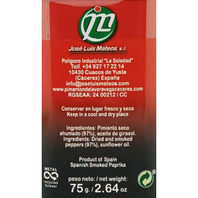 Pimiento seco ahumado: Variedades Jaranda y Jariza, maduros y deshidratados con humo de leña de encina o roble .