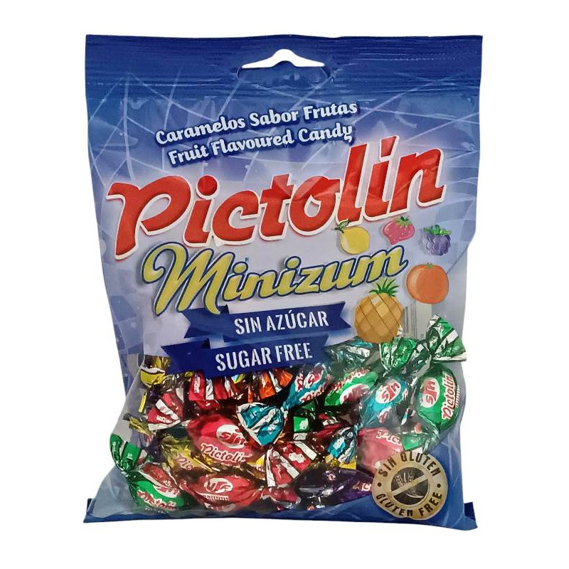 Los caramelos Pictolín Nata Minizum son unos caramelos de confitería que tienen sabor a frutas sin azúcar .