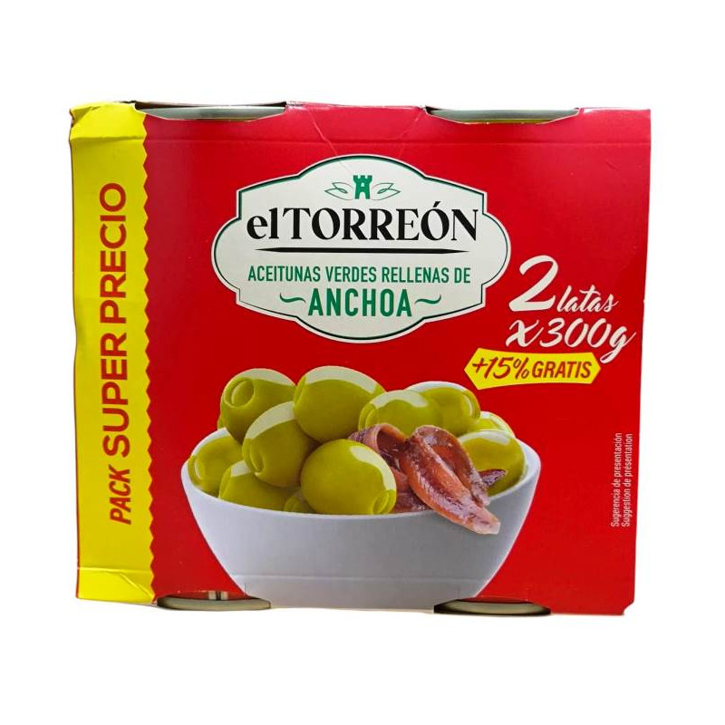 Rellenas de anchoa: Aceituna manzanilla verde con pasta de anchoa (6%) .